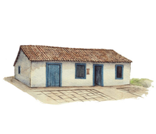 Na Casa do Grito Museu da Cidade de São Paulo, a ilustração de reconstituição do imóvel funciona como um apoio visual muito eficaz para o visitante. A imagem ajuda a imaginar a aparência original da casa, reforçando sua escala modesta, sua implantação simples e sua relação com a paisagem histórica do entorno.