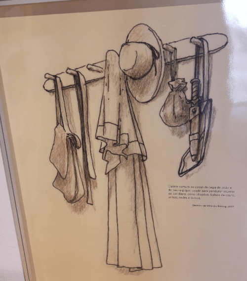 Na Casa do Grito Museu da Cidade de São Paulo, um dos destaques do acervo é a representação dos objetos de uso diário ligados à vida doméstica e rural. A imagem com chapéu, peças de vestuário, bolsa e utensílios reforça a leitura de uma casa simples, funcional e ligada ao cotidiano de circulação, trabalho e apoio aos viajantes do período.