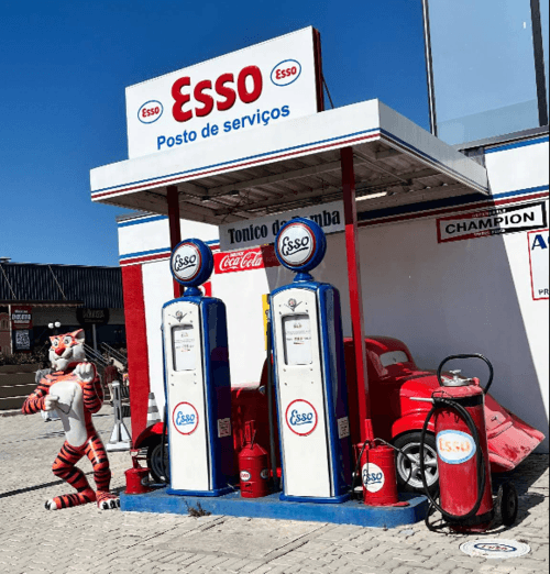 Posto Esso cenográfico e ambientação retrô