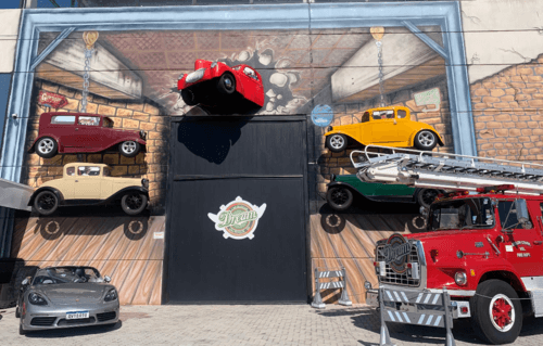 O Dream Car São Roque possui uma área externa bastante chamativa, com fachada cenográfica, pintura temática e veículos posicionados de forma estratégica para impressionar logo na chegada. Esse espaço funciona como cartão-postal do complexo e costuma ser um dos primeiros pontos de parada para fotos antes mesmo do início da visita ao acervo interno.