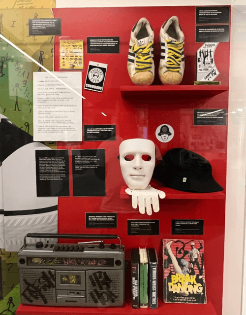A vitrine com tênis, máscara, rádio, livros e outros objetos ligados ao universo do breaking e da cultura de rua funciona como um recorte material da história do Hip Hop. No Museu da Cultura Hip Hop RS, esse tipo de composição ajuda a transformar elementos do cotidiano em patrimônio cultural, aproximando o visitante das linguagens, dos estilos e dos símbolos que marcaram gerações.
