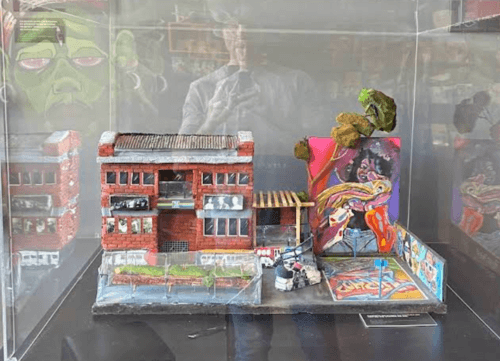 A maquete com edifício, mural e área externa ajuda a visualizar como o Museu da Cultura Hip Hop RS traduz o território urbano para dentro da exposição. Esse destaque é interessante porque reúne arquitetura, graffiti e paisagem periférica em uma linguagem miniaturizada, funcionando como uma síntese visual do universo cultural representado no museu.