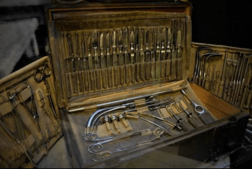 Além das peças anatômicas, o acervo também se relaciona com a história do ensino médico e científico. A imagem com instrumentos antigos remete ao ambiente de estudo, preparação e pesquisa anatômica, ajudando a contextualizar a evolução das práticas usadas na formação de profissionais da saúde.