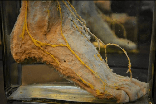O Museu de Anatomia Humana Alfonso Bovero também se destaca pelas preparações anatômicas conservadas, que permitem observar nervos, músculos, vasos e outras estruturas do corpo humano em detalhes. A imagem do pé preservado, com estruturas nervosas destacadas, dialoga diretamente com esse tipo de acervo, pois mostra como a anatomia pode ser estudada de maneira visual e precisa.