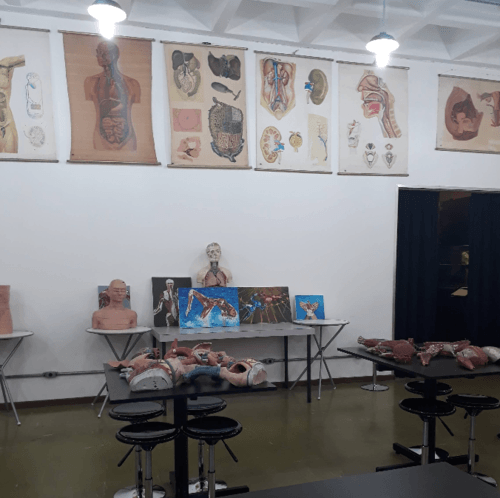 A sala educativa reúne modelos anatômicos, pranchas ilustradas, materiais de apoio e peças que facilitam a compreensão dos sistemas do corpo humano. Esse ambiente reforça o caráter pedagógico do museu e mostra como a anatomia pode ser apresentada de forma acessível para diferentes públicos.