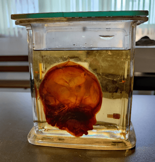 O acervo do Museu de Anatomia Humana Alfonso Bovero inclui peças ligadas ao desenvolvimento humano, que ajudam a compreender fases, estruturas e particularidades da formação do corpo. A imagem da peça conservada em recipiente é adequada para este tópico porque representa o tipo de material anatômico preservado utilizado em estudos científicos e educativos.