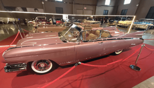 No Museu do Automóvel Pomerode, este conversível em tom rosado chama atenção pelas aletas traseiras alongadas, pela elegância da carroceria e pelo visual exuberante típico do design norte-americano de meados do século passado. É um dos tipos de veículo que melhor traduzem o glamour e a personalidade estética presentes no museu.