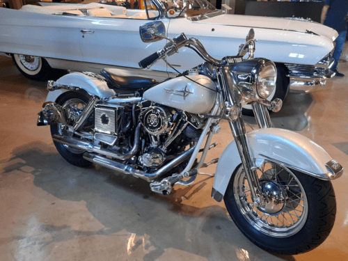 No Museu do Automóvel Pomerode, a presença de uma motocicleta clássica em primeiro plano, acompanhada por um grande conversível ao fundo, amplia a leitura do acervo e mostra que a coleção dialoga com diferentes formas de mobilidade vintage. Esse contraste entre duas rodas e carroceria de luxo enriquece a experiência de visitação e evidencia a diversidade do conjunto exposto.