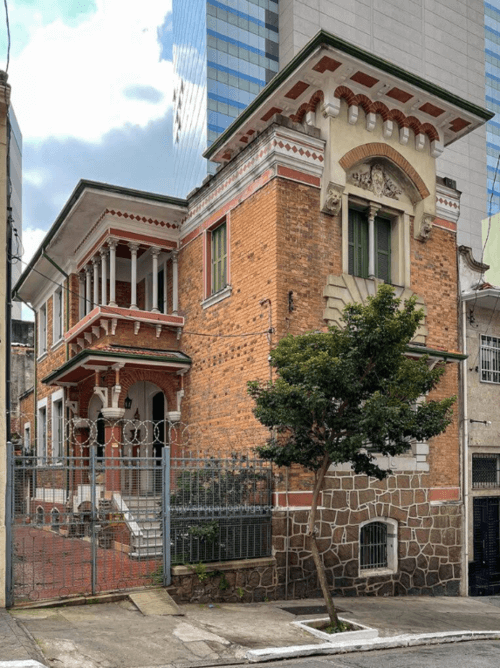 O Museu do Livro Esquecido já começa do lado de fora: observe a ornamentação da fachada, a linguagem florentina/eclética e os detalhes arquitetônicos que fazem a casa “chamar” quem passa na rua.