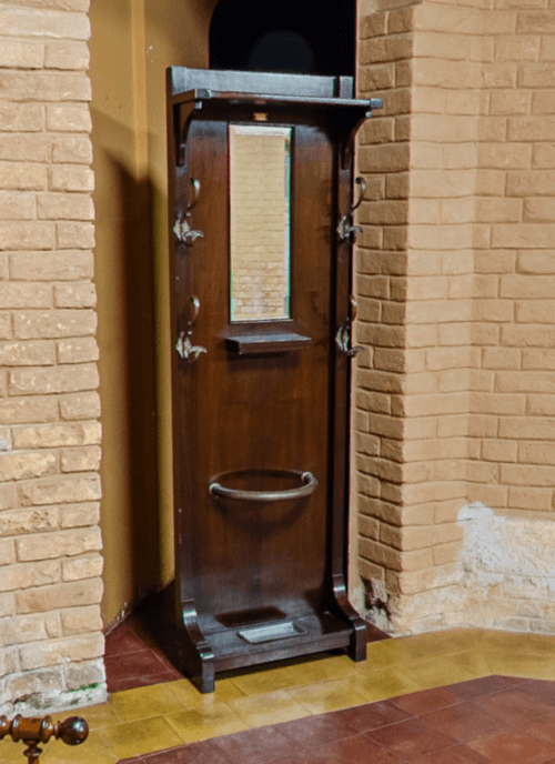 Além das peças mais solenes, o Museu do Tribunal de Justiça do Estado de São Paulo também permite observar objetos de uso cotidiano e mobiliário antigo. A imagem mostra um móvel de madeira com espelho e cabideiros, preservado em um ambiente interno do palacete.
