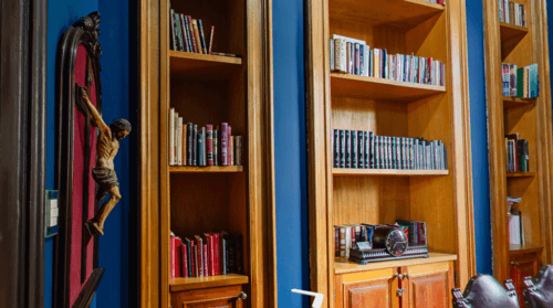 A presença de livros, estantes e referências bibliográficas também faz parte da experiência no Museu do Tribunal de Justiça do Estado de São Paulo. A imagem mostra uma sala com estantes, livros e elementos decorativos, criando um ambiente que remete ao estudo, à pesquisa e à preservação da memória jurídica.