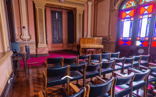 O Museu do Tribunal de Justiça do Estado de São Paulo também conta com ambientes que podem receber apresentações, atividades educativas, visitas monitoradas e ações culturais. A imagem mostra um salão com cadeiras, piano, vitrais coloridos e detalhes arquitetônicos preservados.