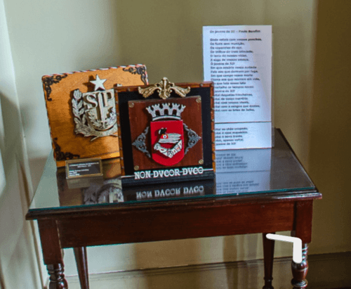 Entre os itens simbólicos do Museu do Tribunal de Justiça do Estado de São Paulo, aparecem brasões, insígnias e objetos que remetem à identidade paulista. A imagem mostra peças com o brasão do Estado de São Paulo e a inscrição latina “Non Ducor Duco”, tradicionalmente associada ao lema da cidade de São Paulo.