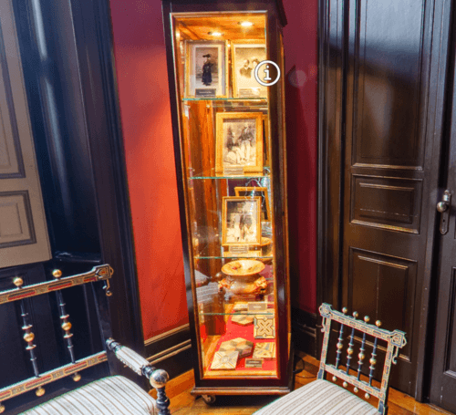 Vitrines com fotografias, retratos e objetos decorativos