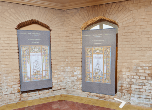 Um dos pontos interessantes para observar no museu são os painéis expositivos dedicados ao Dia da Justiça e às virtudes associadas ao universo jurídico. Na imagem, aparecem painéis com os temas “Passado” e “Esperança”, instalados em uma área com paredes de tijolos aparentes.