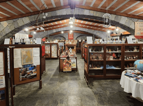 A visão ampla do interior do museu mostra a organização das vitrines, painéis, objetos, mapas, bandeiras e peças decorativas. Esse conjunto permite perceber a riqueza do acervo mesmo em um espaço de visitação mais compacto. A sala reúne diferentes camadas da história finlandesa em Penedo, combinando objetos pessoais, registros culturais e materiais explicativos.