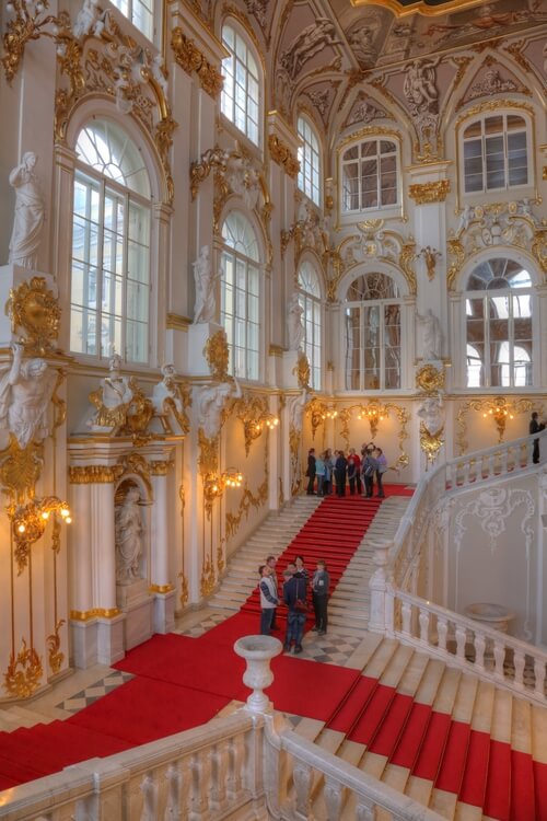 Um dos cenários mais marcantes do Museu Hermitage é a sua monumental escadaria interna, que impressiona pelo uso de mármore, douramentos, esculturas e pelo impacto visual do espaço. Esse é um dos pontos mais fotografados do museu e já antecipa ao visitante a atmosfera palaciana e cerimonial do antigo complexo imperial.