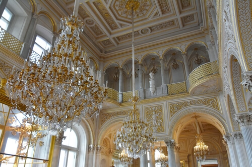 Além das galerias de exposição, o Museu Hermitage encanta pelos salões nobres, com tetos trabalhados, lustres monumentais, douramentos e detalhes decorativos que transformam a circulação pelo museu em uma experiência visual completa. Em muitos momentos, a arquitetura e a decoração dos ambientes rivalizam com o próprio acervo em impacto e beleza.
