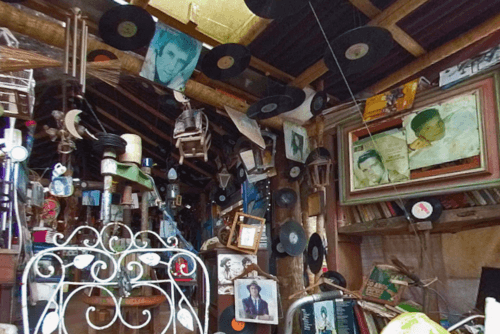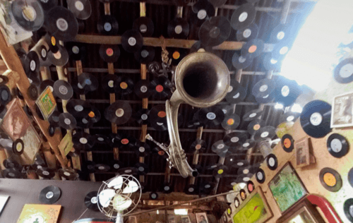 O Museu Jeca Tatu também chama atenção pelo uso criativo de discos de vinil na decoração dos ambientes. Na imagem, os discos ocupam o teto e as paredes, formando uma instalação visual que remete à música popular, aos antigos toca-discos e à memória sonora de várias gerações.