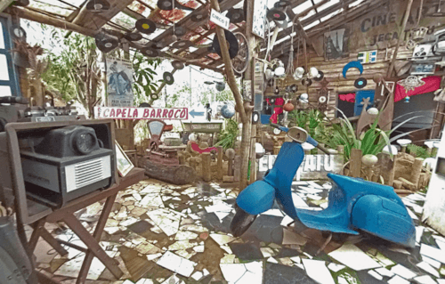 Esse trecho da visita é ideal para fotos, pois reúne objetos de grande apelo visual em um espaço aberto e descontraído. A lambreta, as placas e o antigo equipamento de projeção ajudam a reforçar o caráter nostálgico e teatral do museu.