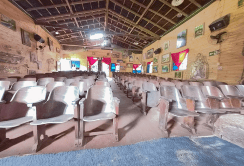 O Museu Jeca Tatu também possui um auditório amplo, com fileiras de cadeiras antigas e paredes decoradas com quadros e objetos. Esse ambiente reforça o papel do espaço como centro multicultural, não apenas como museu de antiguidades.