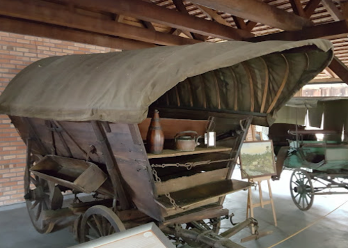 Um dos pontos mais interessantes para observar no Museu Nacional de Imigração e Colonização são os veículos de transporte de carga e apoio à vida rural. A carroça coberta chama atenção pelo porte e pela rusticidade, funcionando como um elemento visual forte para explicar como mercadorias, utensílios e pessoas se deslocavam em contextos históricos muito diferentes dos atuais.