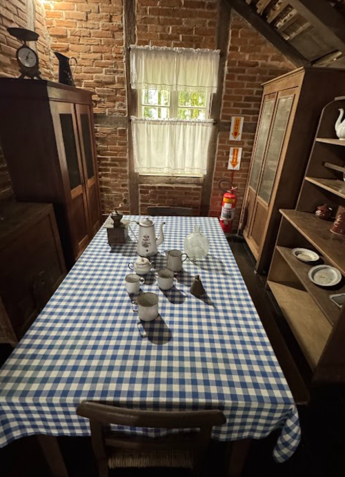 Outro destaque do percurso no Museu Nacional de Imigração e Colonização é a ambientação ligada à rotina alimentar e ao uso doméstico dos utensílios. A mesa com louças, os armários de madeira e a configuração simples do espaço ajudam a mostrar como a cozinha e as áreas de refeição tinham papel central na organização da casa e da vida cotidiana.